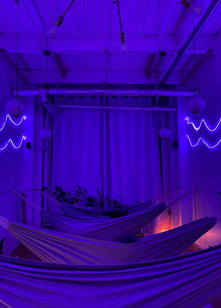 Now offering ethereal hammock sound baths in Toronto (Tkaronto) ––an immersive experience where sound and weightlessness unite. Suspended in a soft cocoon, you'll be enveloped by vibrations from singing bowls and other live instruments, creating the space for stress to melt away as your body surrenders to a symphony of sound. Many people book this one-of-a-kind journey to support calming the nervous system, clearing energetic blockages, and inviting in profound restoration. However you experience it, a hammock sound bath invites you to slow down, tune in, and explore the effects of sound in a supportive setting.