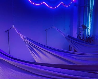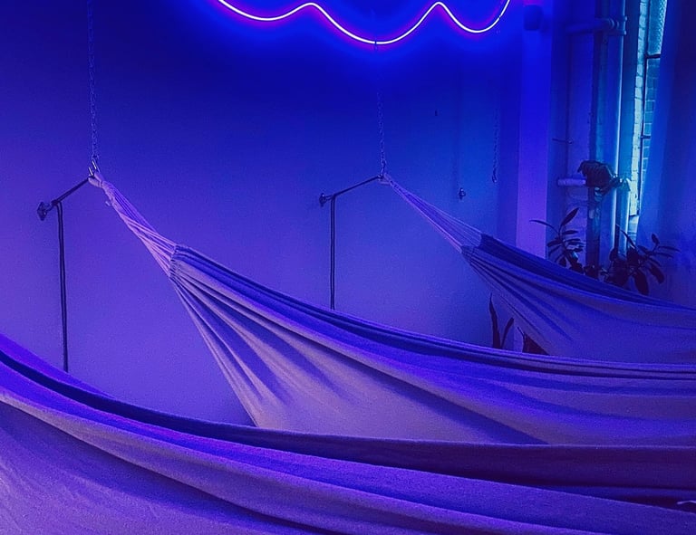 Experience deep, weightless relaxation while suspended in a cotton hammock, allowing the sound vibrations to cradle you into a meditative state.